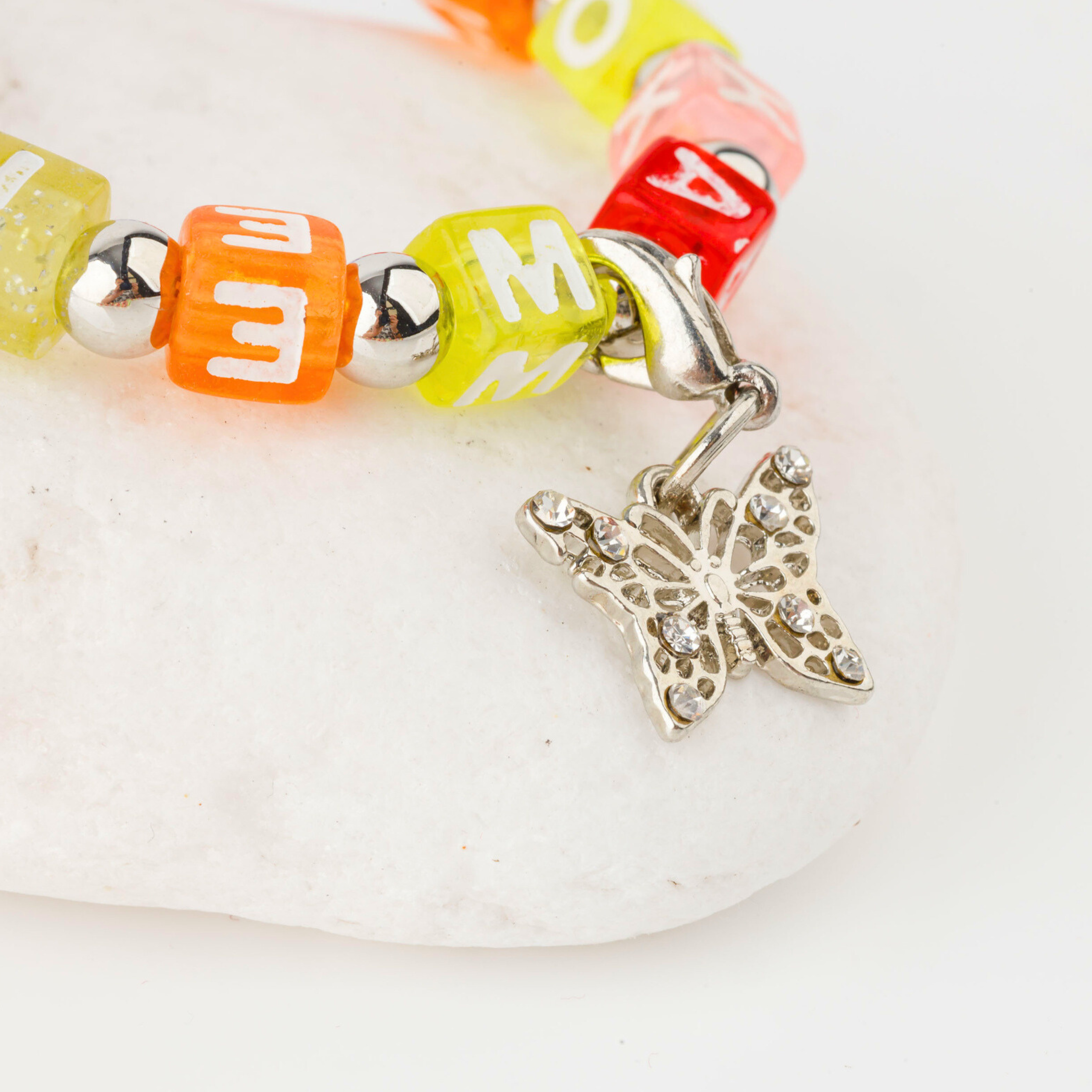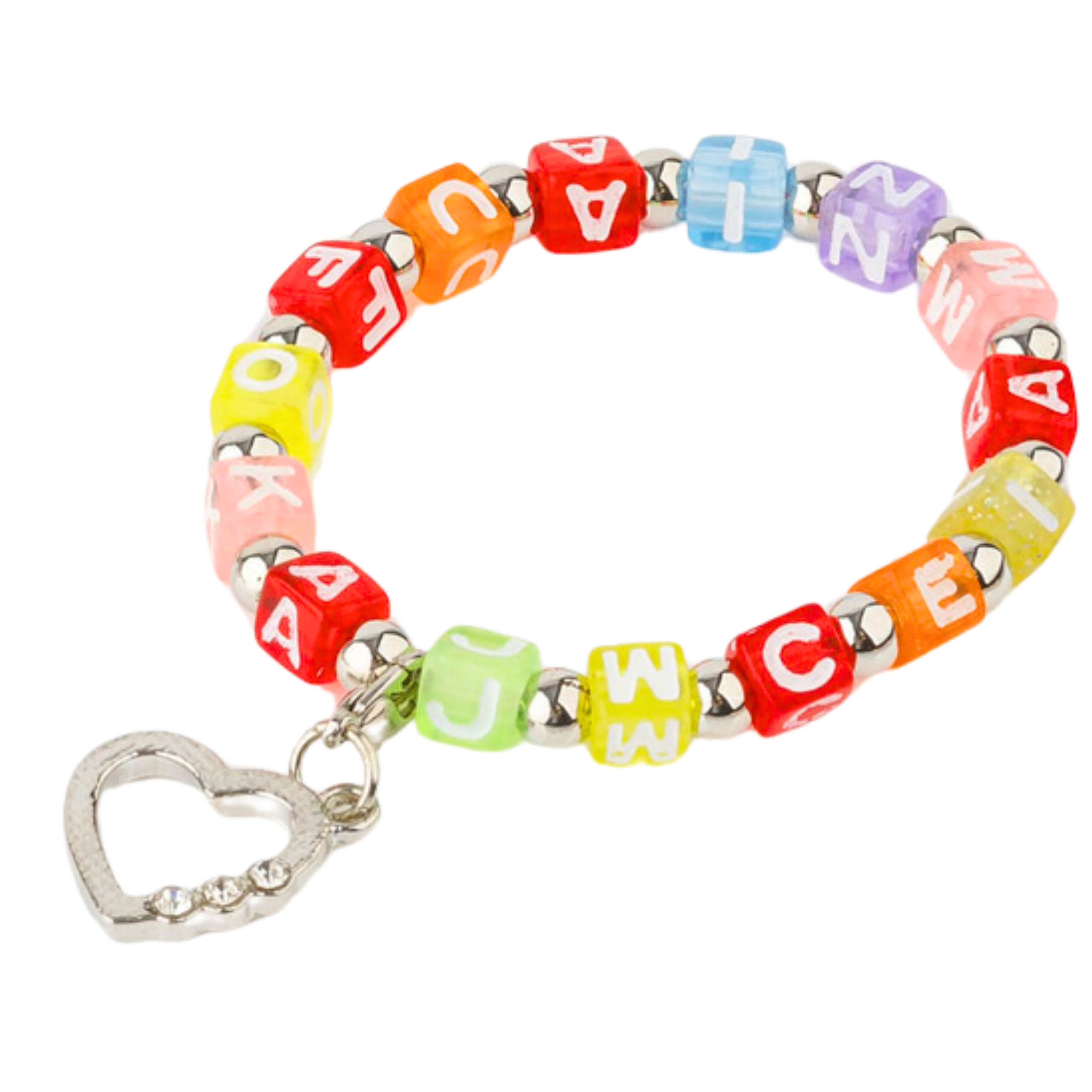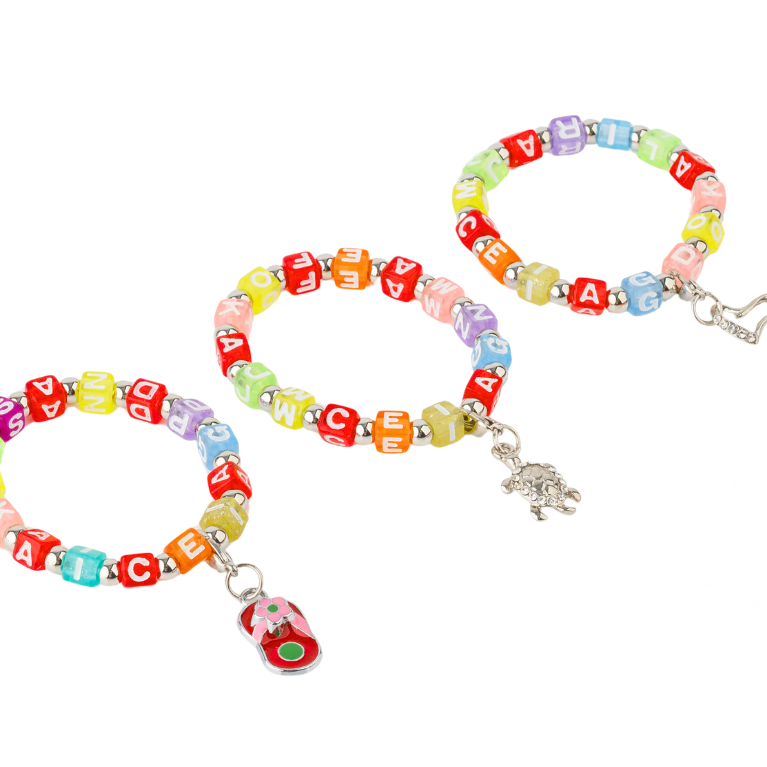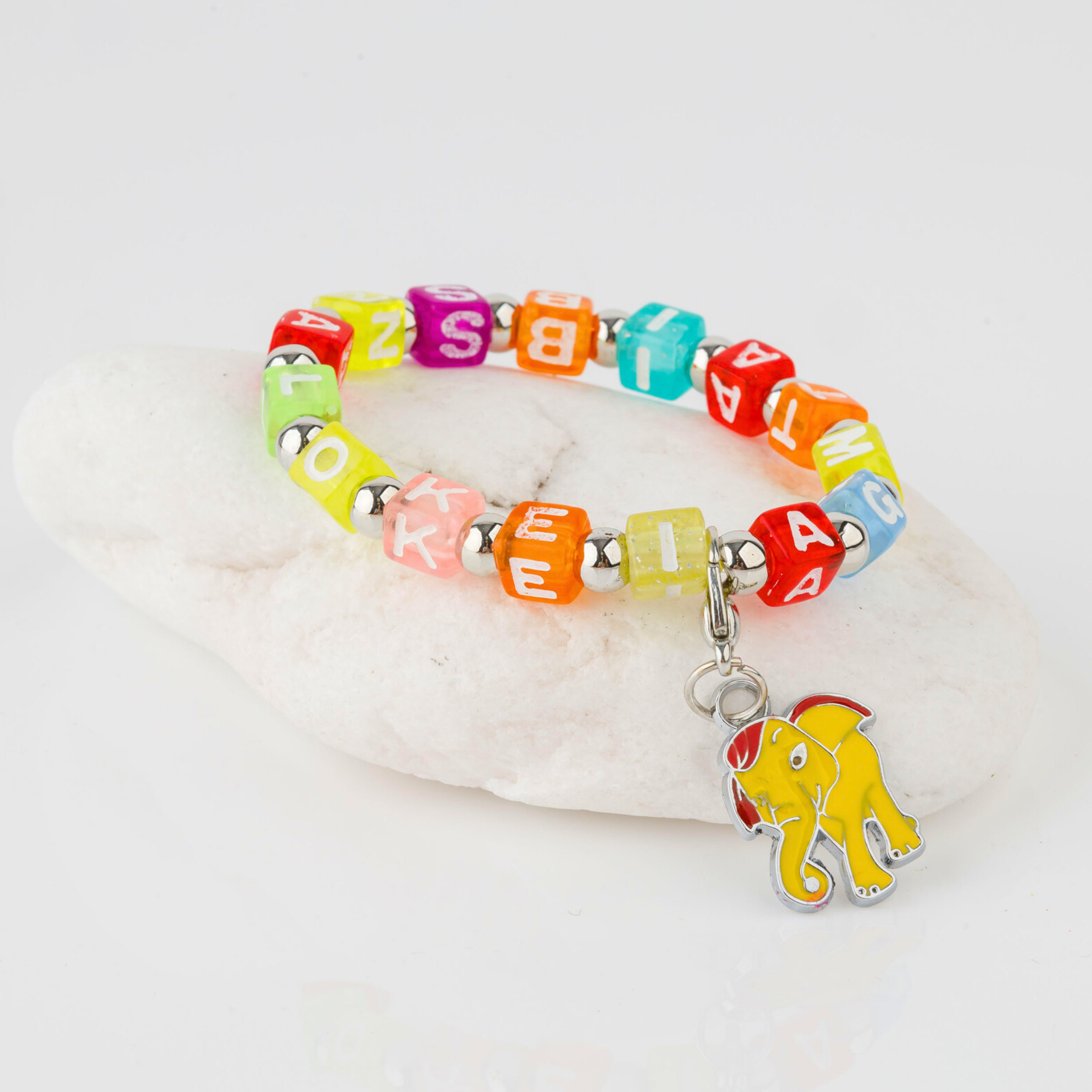 Bransoletka dziecięca – wzór: kwadratowe koraliki literki z przywieszką mix