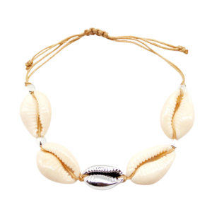 Oryginalna bransoletka z naturalnych muszelek cowrie, z ozdobną metalizowaną muszlą w kolorze srebrnym na środku, to stylowy dodatek, który podkreśli Twoją wakacyjną stylizację.
