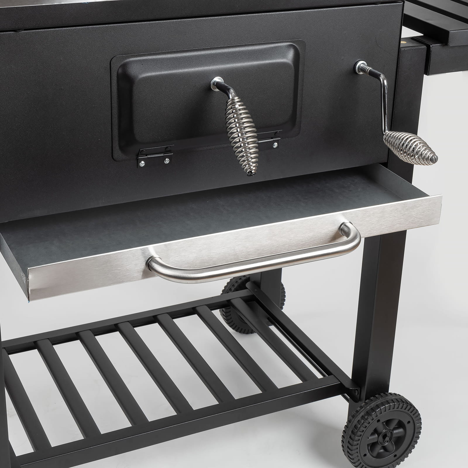 Dodatkowym wyposażeniem grilla jest składana półka. Grillując, niejednokrotnie mierzyłeś się z dylematem gdzie, możliwie szybko odłożyć przygotowane kawałki jedzenia, bądź miałeś wykładaniem na ruszt bo jedna ręka była zajęta trzymaniem tacy z surowymi produktami? Ten problem został rozwiązany. Składana półeczka umiejscowiona z boku rusztu będzie wybawieniem od powyższych sytuacji. Dolna półka pod rusztem może posłużyć za miejsce do składowania brykietu i innych akcesoriów niezbędnych w trakcie grillowania.