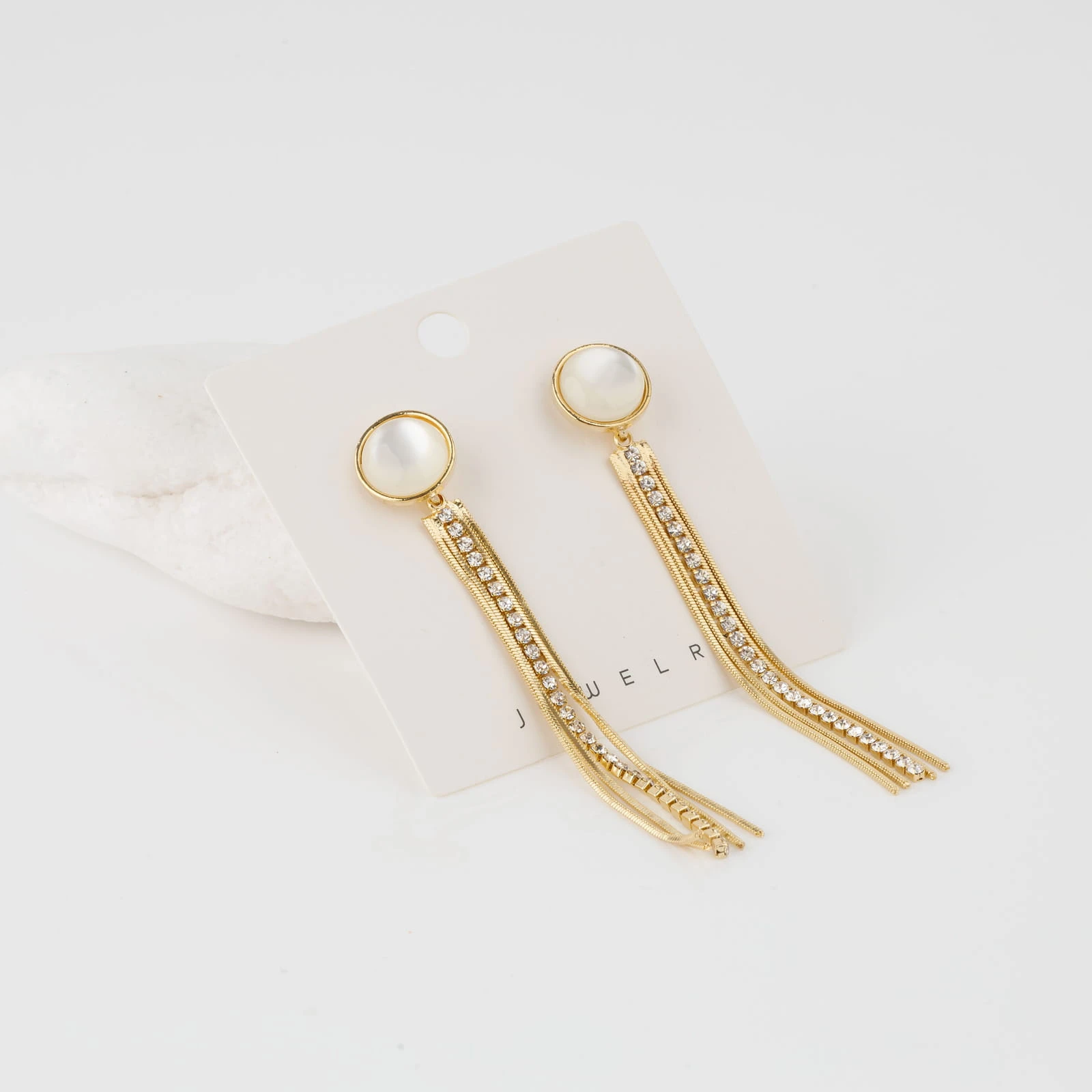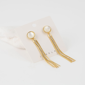 Te eleganckie kolczyki łączą w sobie klasykę i nowoczesność. Górna część zdobiona jest imitacją perły w złotej oprawie, natomiast dolna składa się z subtelnych łańcuszków, ozdobionych rzędem połyskujących cyrkonii, które pięknie odbijają światło i dodają blasku każdej stylizacji.