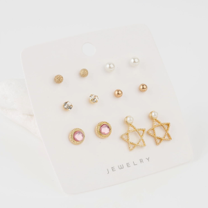 Stylowy komplet kolczyków, który zawiera 6 różnych par wkrętek i jedną parę kolczyków wiszących z delikatną zawieszką w kształcie złotej gwiazdki z perłą. Pozostałe kolczyki to m.in. klasyczne perły, błyszczące cyrkonie, kuleczki w złotym odcieniu oraz różowe oczka w złotej ramce.