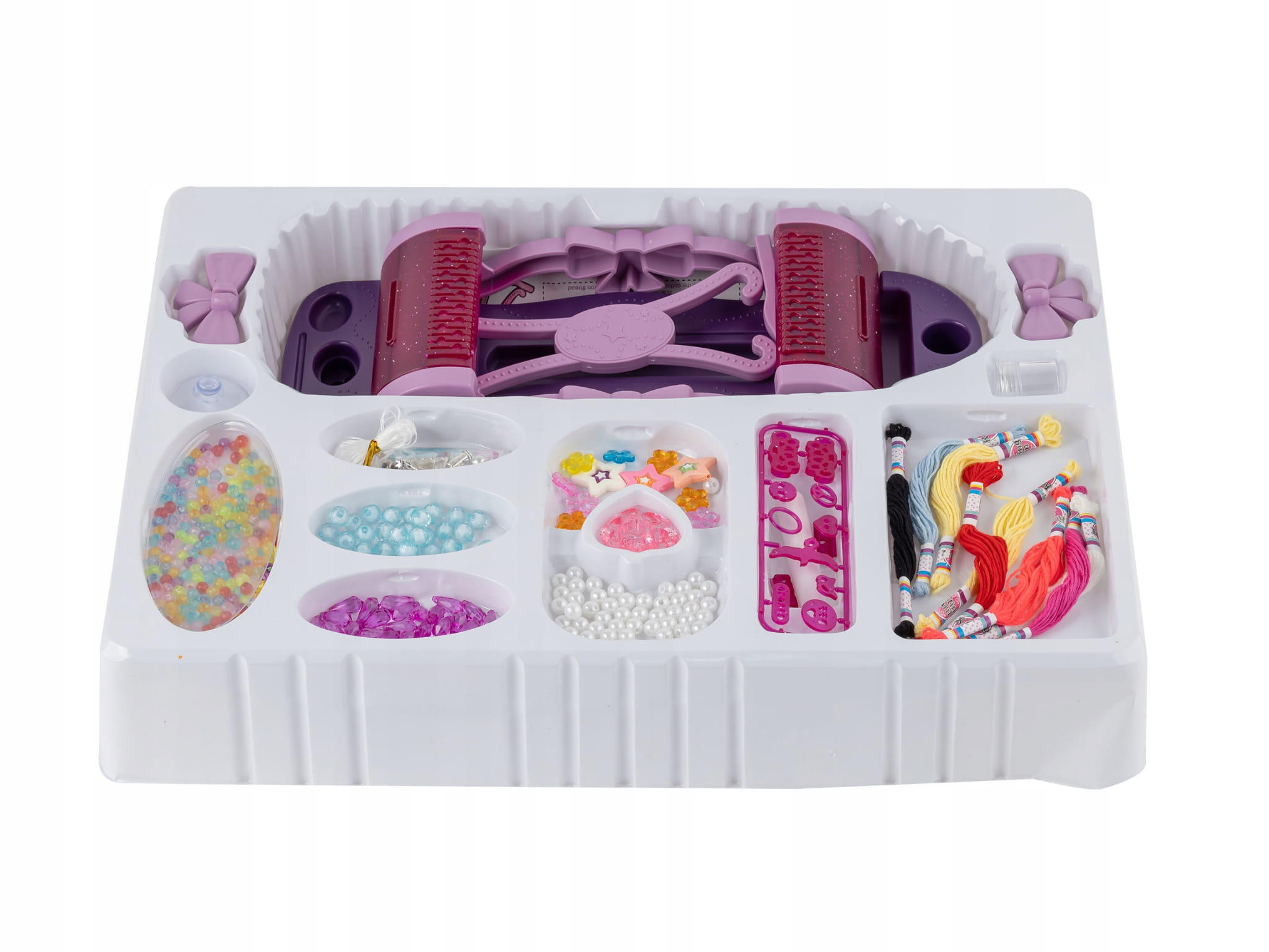 Koralików w różnych wzorach i kolorach, motki muliny, wstążka, zapięcia do bransoletek. To kompleksowy zestaw, który z pewnością zachwyci każdą małą fankę biżuterii.