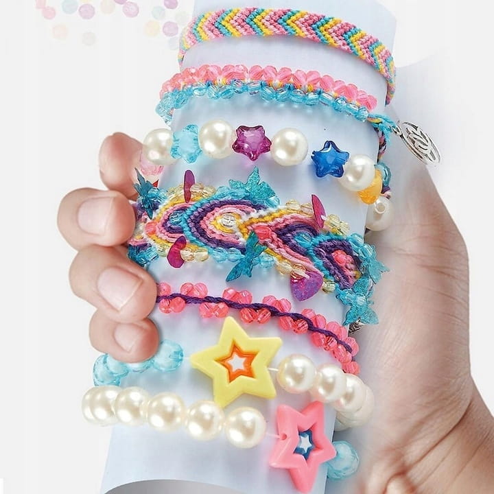 Zestaw do robienia biżuterii z krosnem do zaplatania to idealne narzędzie dla każdej młodej projektantki. Prosta w obsłudze maszynka umożliwia tworzenie unikalnych, plecionych bransoletek z wykorzystaniem dołączonych koralików, muliny i cekinów