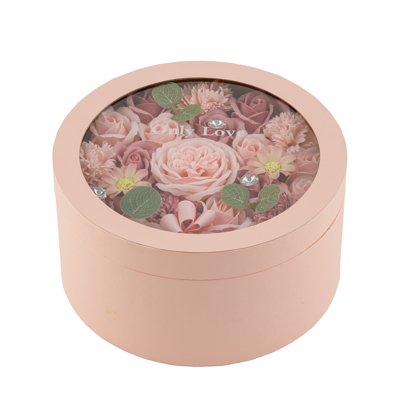 Kwiaty w odcieniach różu i brudnego różu, ozdobione delikatną zielenią i kryształkami, zamknięte są w pięknym pudełku z napisem „Only Love”.