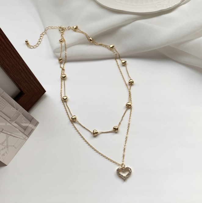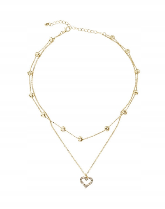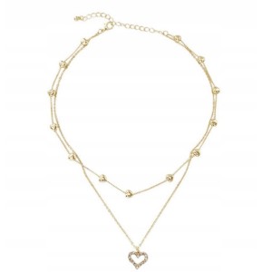 Elegancki, podwójny naszyjnik wykonany z wysokiej jakości stali chirurgicznej. Składa się z dwóch delikatnych łańcuszków: krótszy ozdobiony drobnymi kulkami, dłuższy zakończony zawieszką w kształcie ażurowego serca wysadzanego błyszczącymi cyrkoniami. Złoty kolor nadaje biżuterii luksusowego wyglądu i świetnie komponuje się zarówno z codziennymi, jak i wieczorowymi stylizacjami.