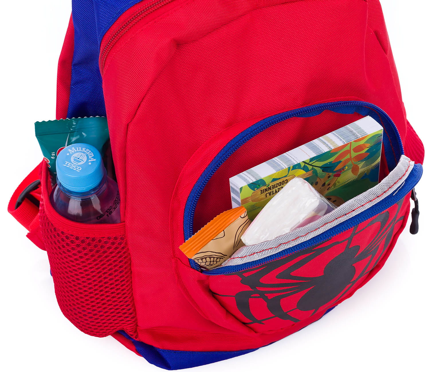 Obszerna komora główna plecaczka, kieszonka wewnętrzna i zewnętrzna oraz boczne z siateczki pomieszczą wszystkie drobiazgi, drugie śniadanie oraz napoje.