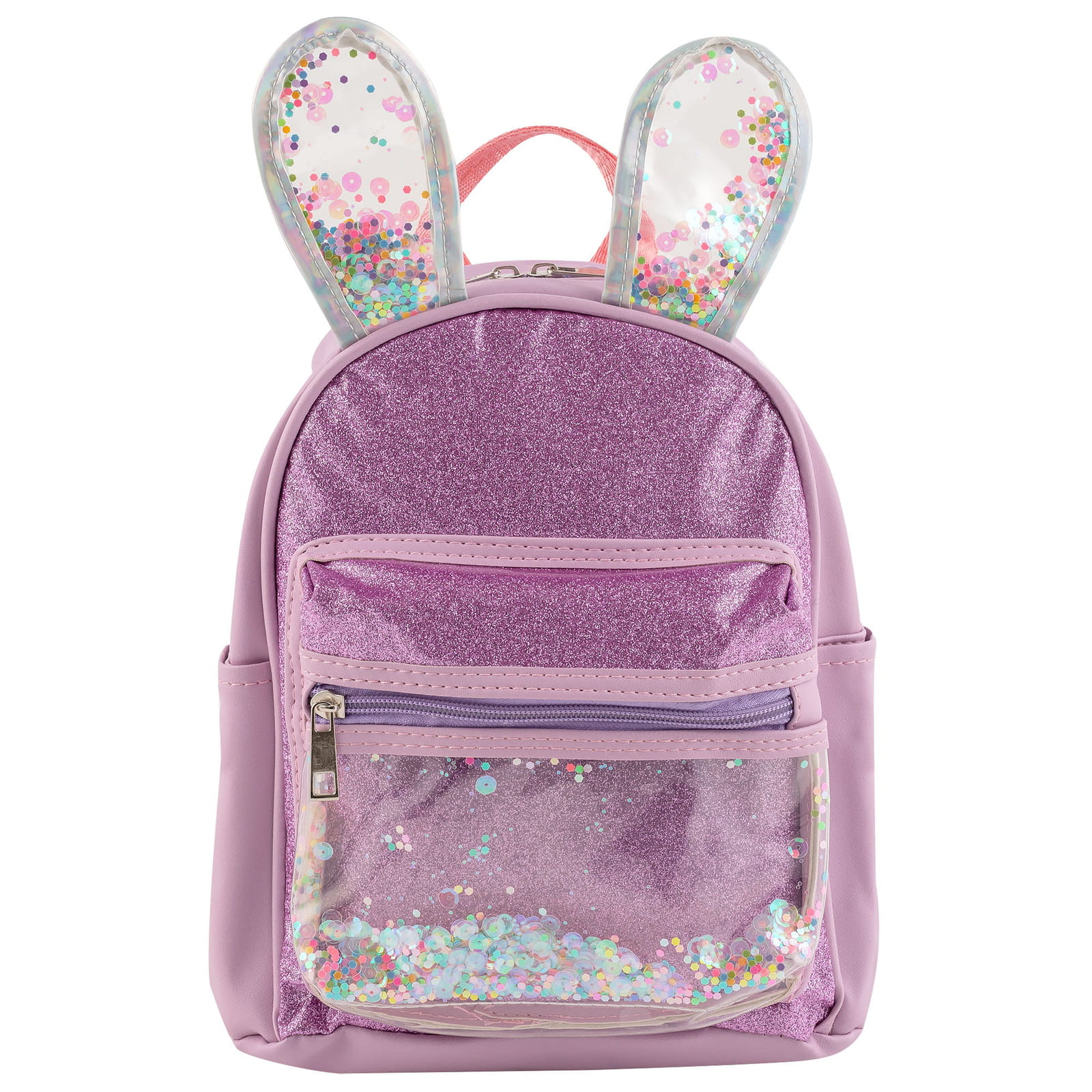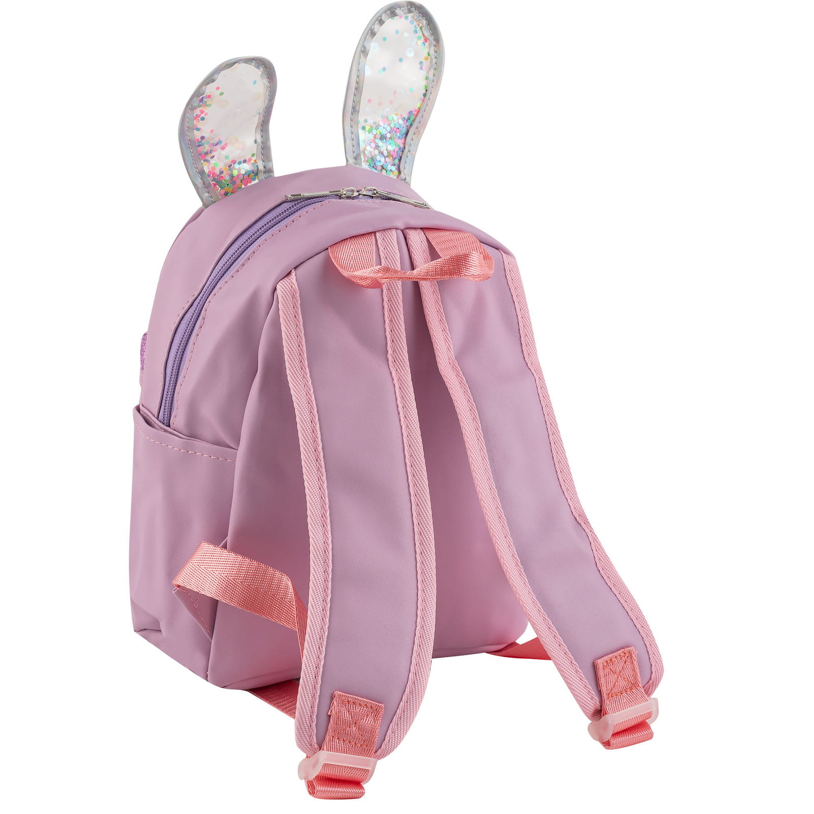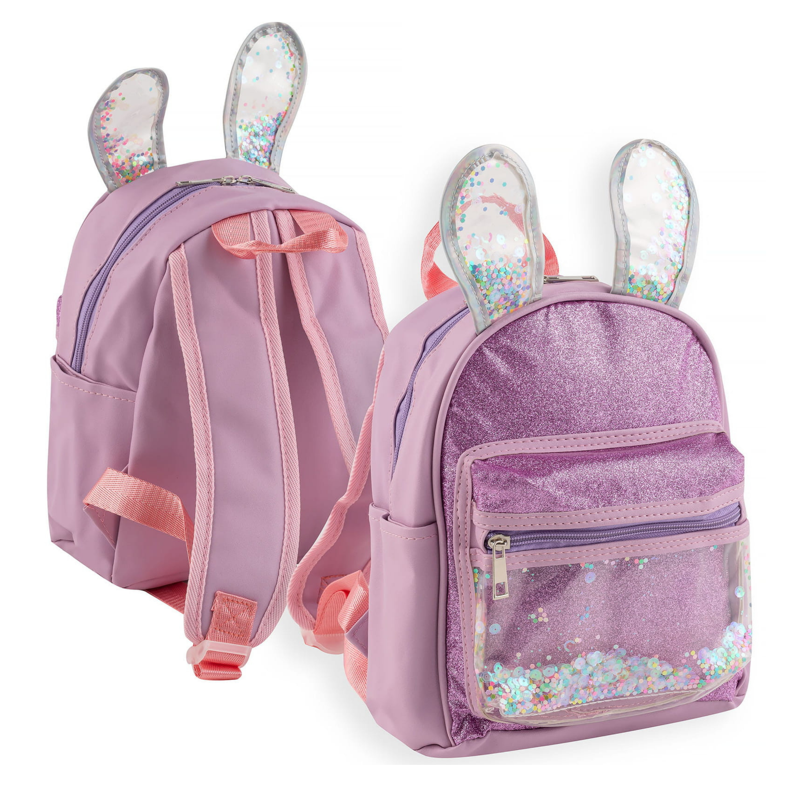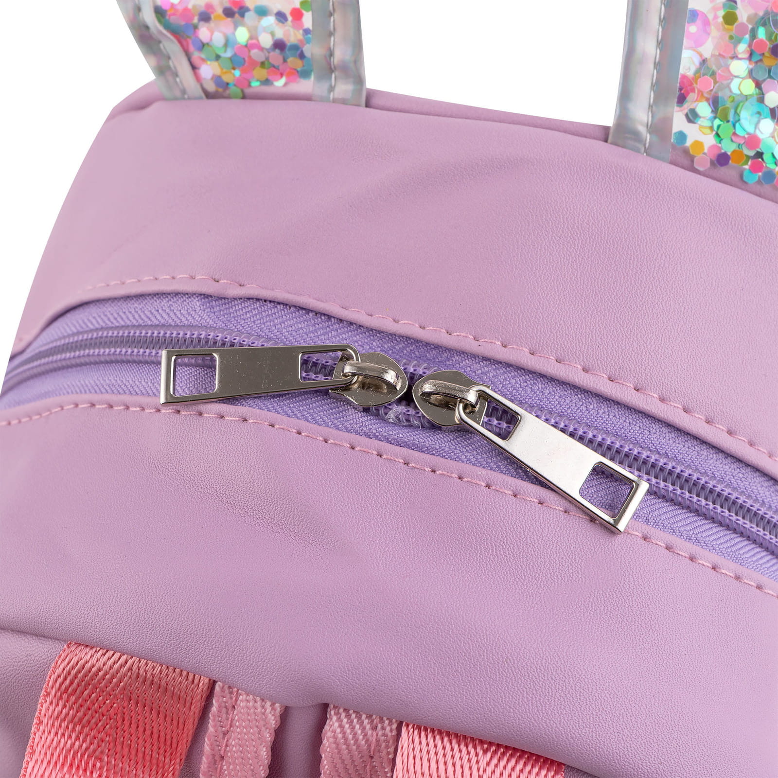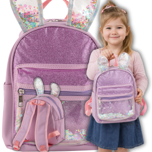 Brokatowy plecaczek dla dziewczynki z uszkami króliczka to wspaniały dodatek który zachwyci każdą małą księżniczkę. Przednia część plecaka została wykonana z materiału imitującego brokat, który wspaniale połyskuje i błyszczy. Przednia kieszonka jest przezroczysta i znajdują się w niej wielokolorowe cekiny. Plecak posiada regulowane szelki, uchwyt do powieszenia oraz dodatkową przednią kieszonkę.