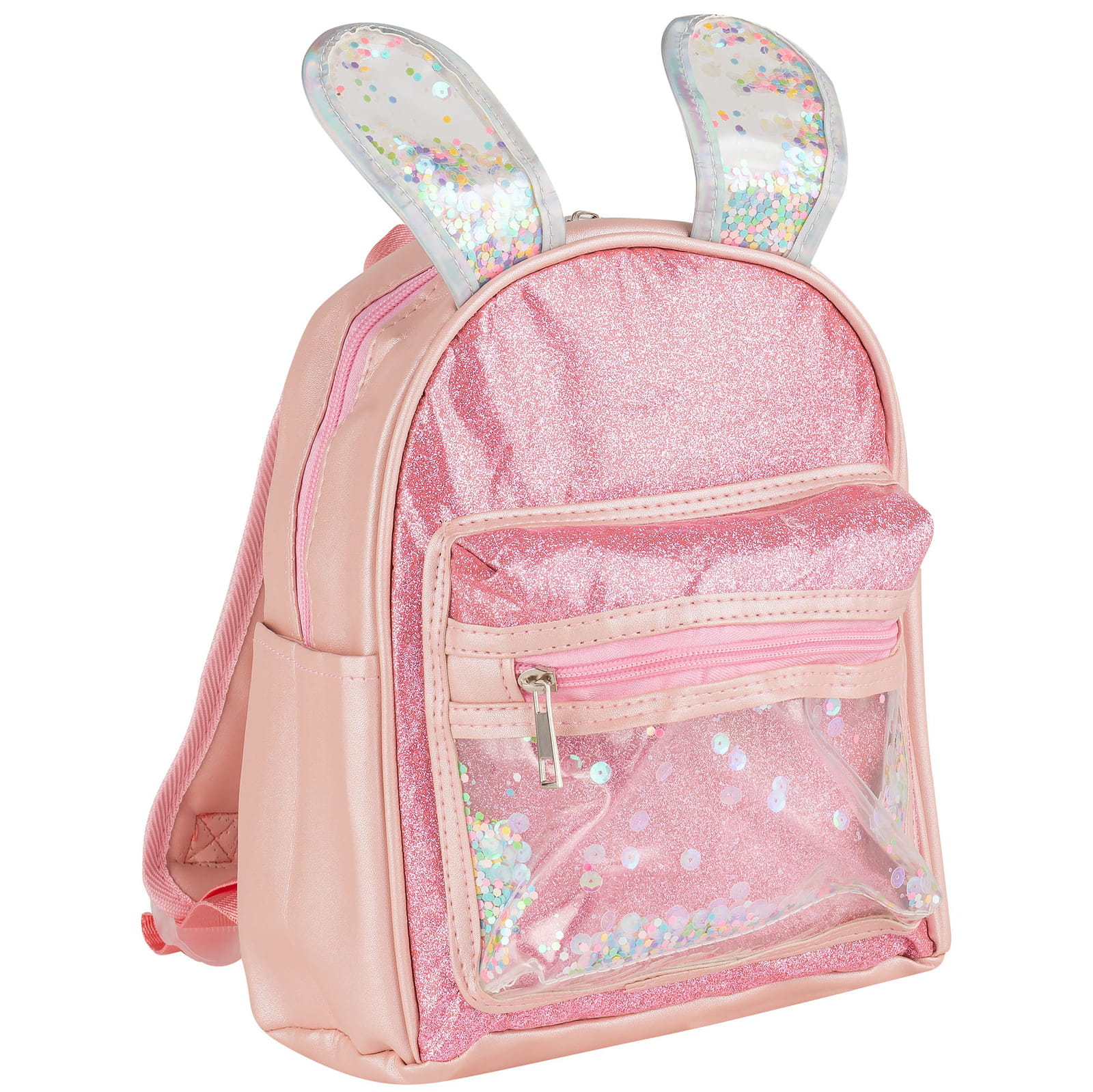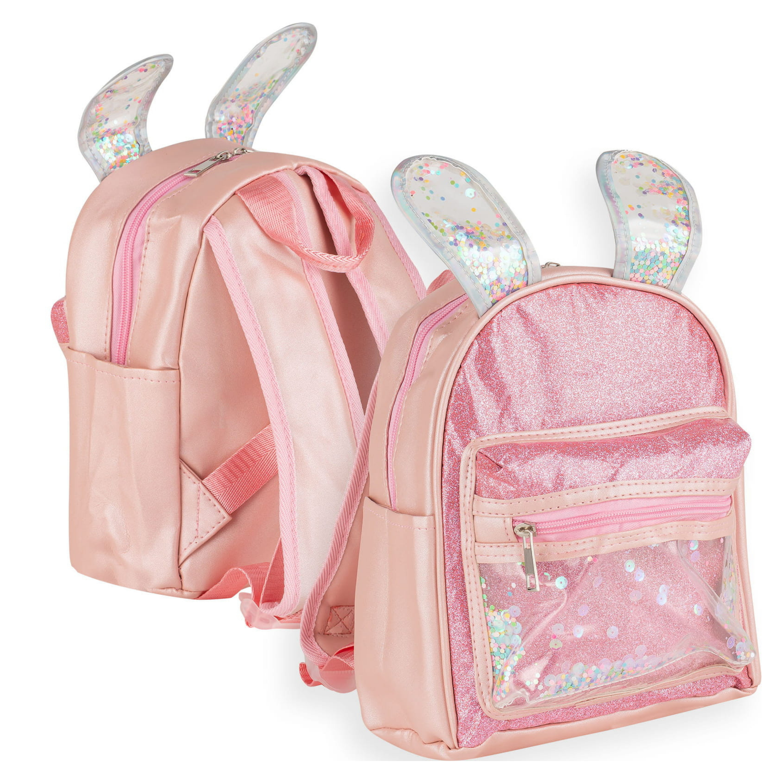 Brokatowy plecaczek dla dziewczynki z uszkami króliczka to wspaniały dodatek który zachwyci każdą małą księżniczkę. Przednia część plecaka została wykonana z materiału imitującego brokat, który wspaniale połyskuje i błyszczy. Przednia kieszonka jest przezroczysta i znajdują się w niej wielokolorowe cekiny. Plecak posiada regulowane szelki, uchwyt do powieszenia oraz dodatkową przednią kieszonkę.