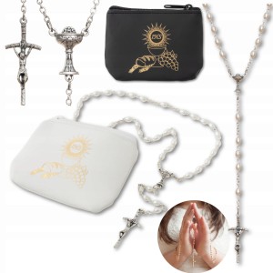 Wybierz różaniec komunijny ze szklanych, perłowych paciorków oval – elegancki, symboliczny i gotowy do wręczenia w sakiewce komunijnej.