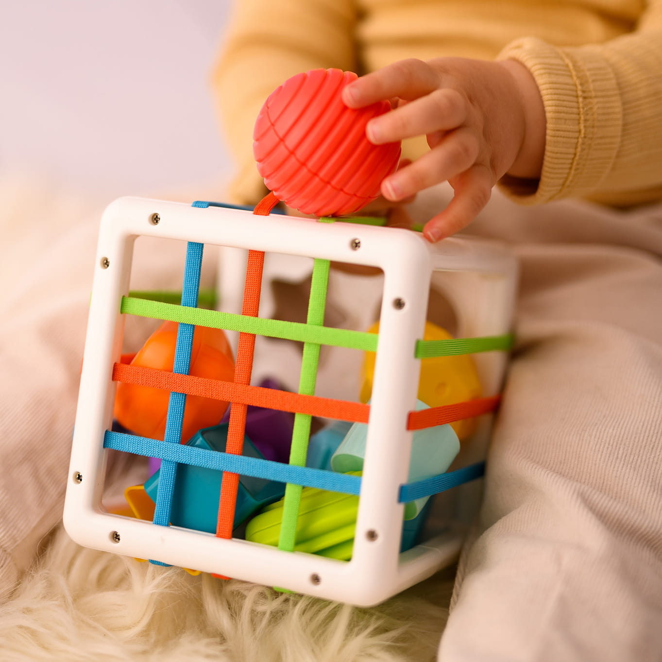 Sorter posiada kilka rodzajów ścianek – elastyczne paski, przez które można przeciskać klocki, klasyczny sorter z otworami do dopasowywania oraz bok z siateczką. To zabawa pełna wyzwań, eksperymentów i uśmiechu
