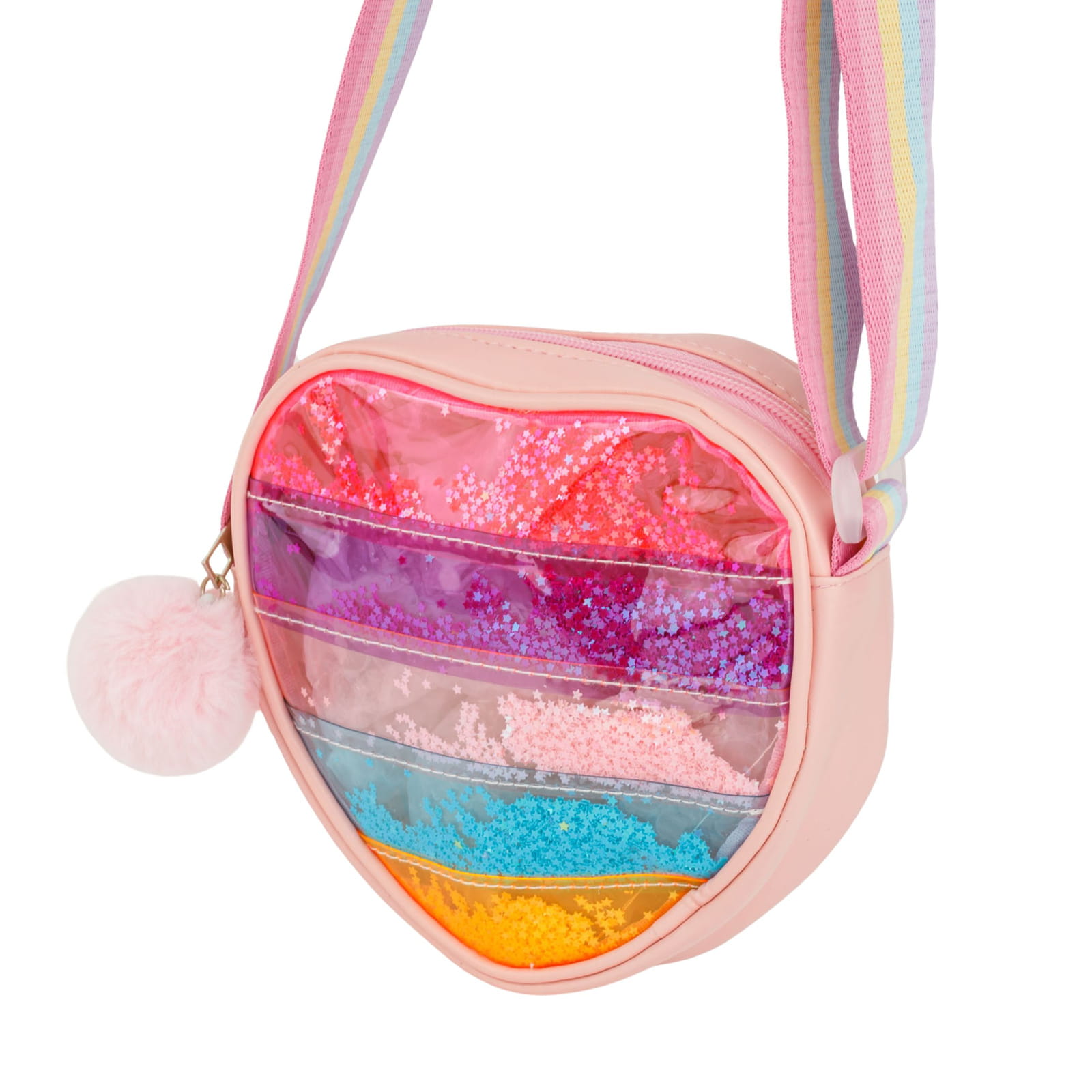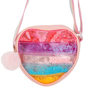 Przedstawiamy kolorową torebkę w kształcie serca z warstwami błyszczących cekinów-gwiazdek i uroczym, miękkim pomponem. Idealna dla dziewczynki, która lubi wyrażać siebie poprzez styl – i kocha wszystkie kolory tęczy!