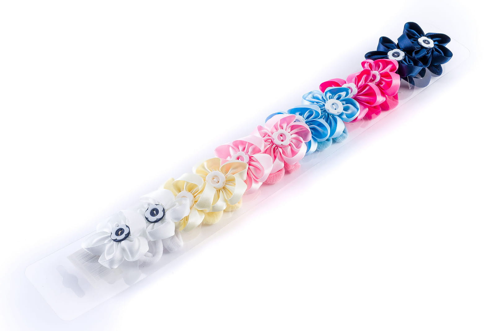 Zestaw 12 gumek frotek do włosów z efektownymi satynowymi kwiatkami ozdobionymi dekoracyjnym guziczkiem. Elastyczne i delikatne, idealnie trzymają włosy bez ciągnięcia i plątania. Kolorowa kompozycja sprawia, że zestaw świetnie nadaje się dla dzieci, a szczególnie dla dziewczynek do codziennego użytku i stylizacji.