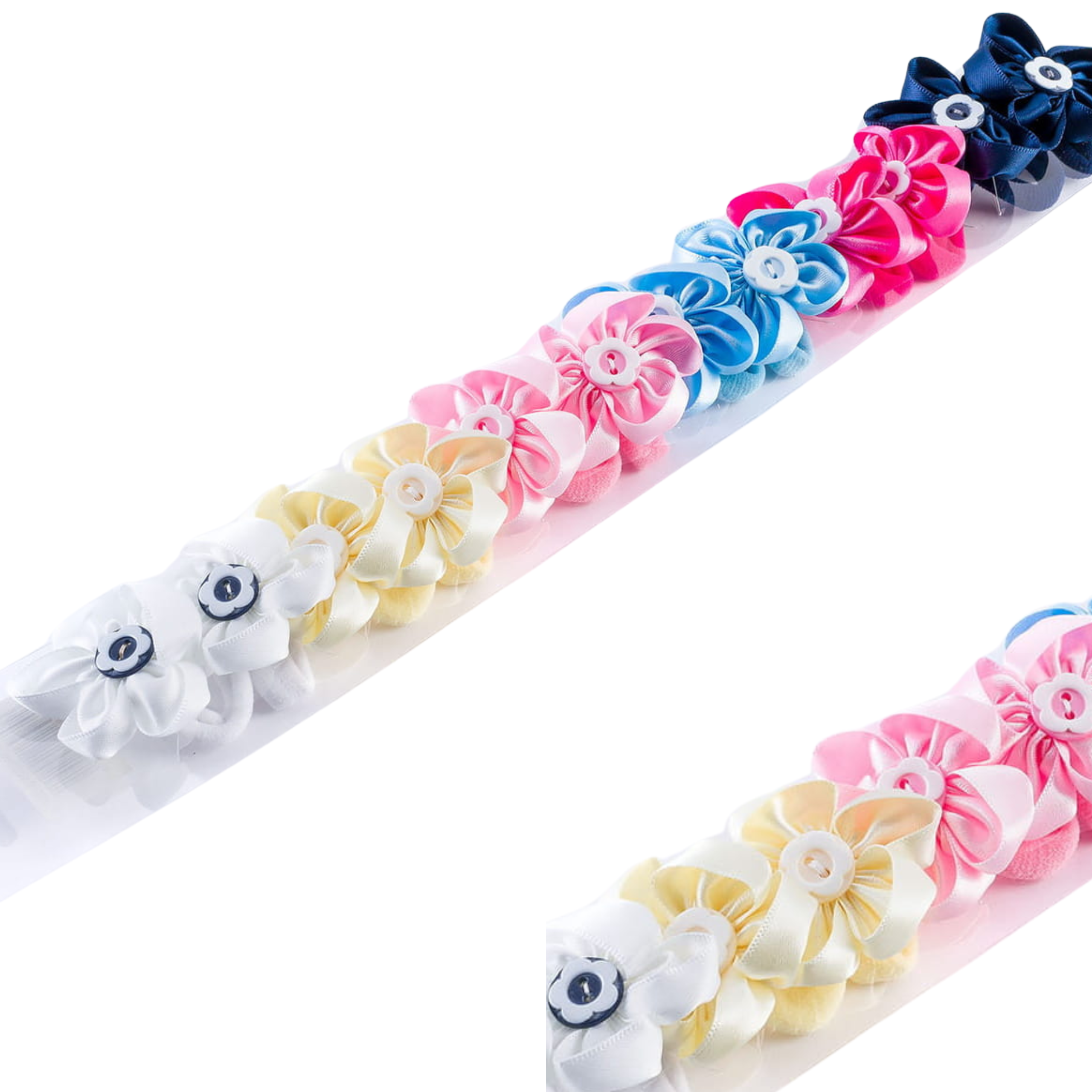 Zestaw 12 gumek do włosów z satynowym kwiatkiem i guzikiem – kolorowe frotki dla dziewczynek