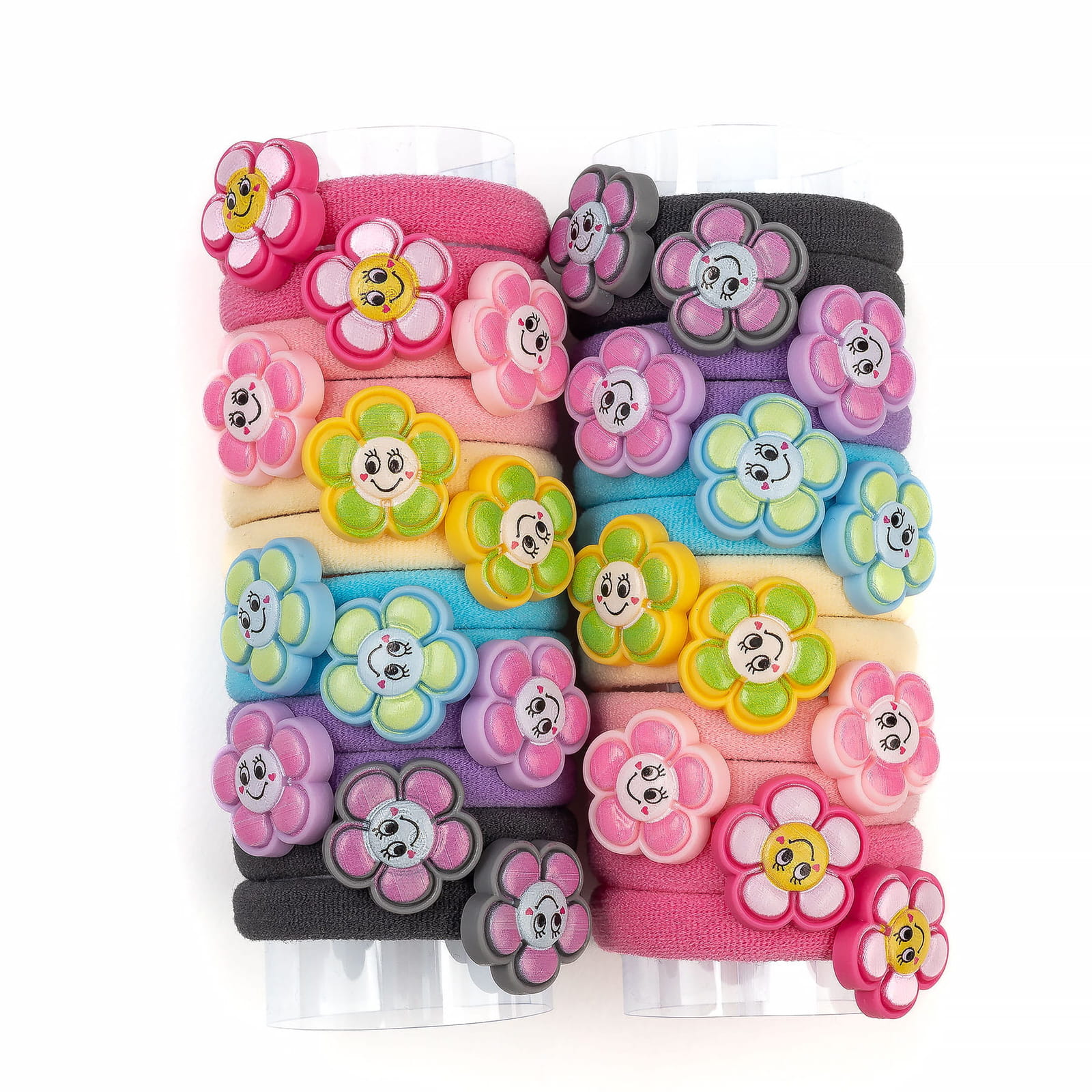 Wesoły zestaw 24 elastycznych gumek frotek do włosów z kolorową ozdobą w postaci uśmiechniętego kwiatka. Te gumki nie tylko świetnie trzymają włosy, ale też poprawiają humor! Idealne do szkoły, przedszkola, na prezent lub jako drobny upominek dla każdej małej miłośniczki kolorowych dodatków.