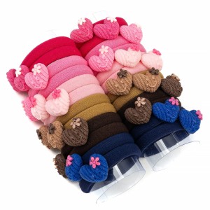 Praktyczny i uroczy zestaw 24 elastycznych gumek frotek do włosów, ozdobionych serduszkiem z efektem dzianiny oraz kwiatkiem. Gumki dostępne są w pięknej gamie kolorów – od pastelowych różów, przez brązy, aż po granaty. Idealne do codziennego noszenia – do szkoły, przedszkola, na spacery, a także na prezent dla każdej miłośniczki kolorowych dodatków do włosów.