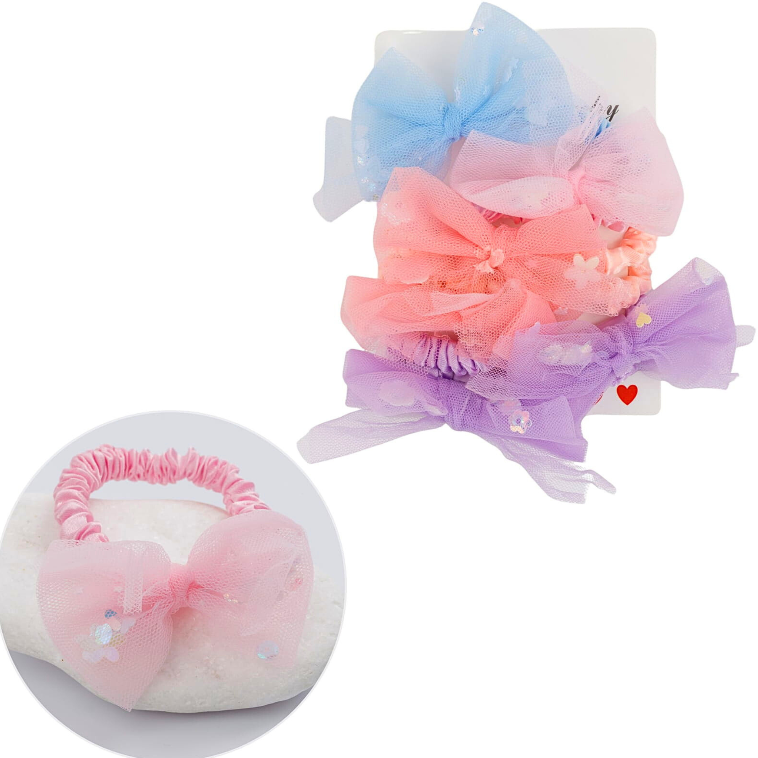 Zestaw 6 tiulowych gumek frotek do włosów z kokardką i brokatem – ozdobne pastelowe frotki dla dziewczynek