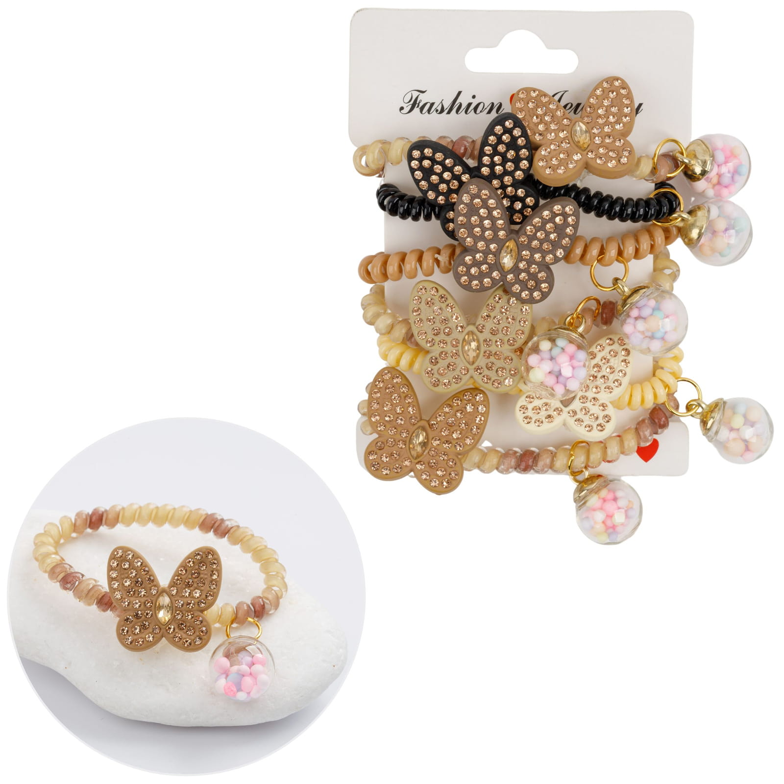 Zestaw 6 gumek sprężynek do włosów z eleganckimi motylkami zdobionymi cyrkoniami oraz uroczymi zawieszkami w formie kulek z kolorowymi koralikami. Elastyczne i trwałe frotki typu "sprężynka" świetnie sprawdzają się przy różnych fryzurach – nie ciągną włosów i nie plączą ich. Idealne do codziennego noszenia oraz jako stylowy dodatek do dziewczęcych stylizacji.