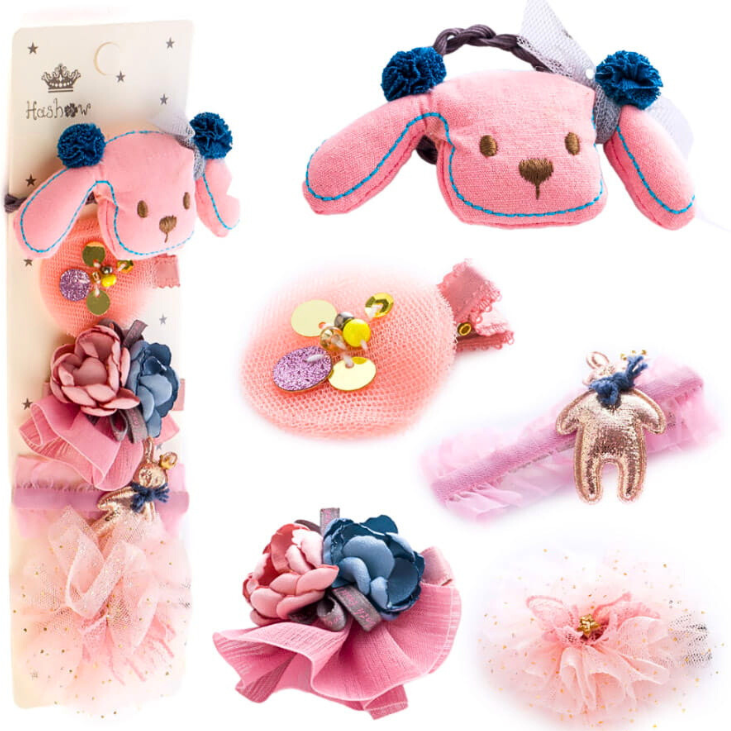 Przedstawiamy słodki zestaw akcesoriów do włosów w dziewczęcych odcieniach różu. W skład kompletu wchodzi gumka z maskotką pieska oraz trzy urocze spinki.
